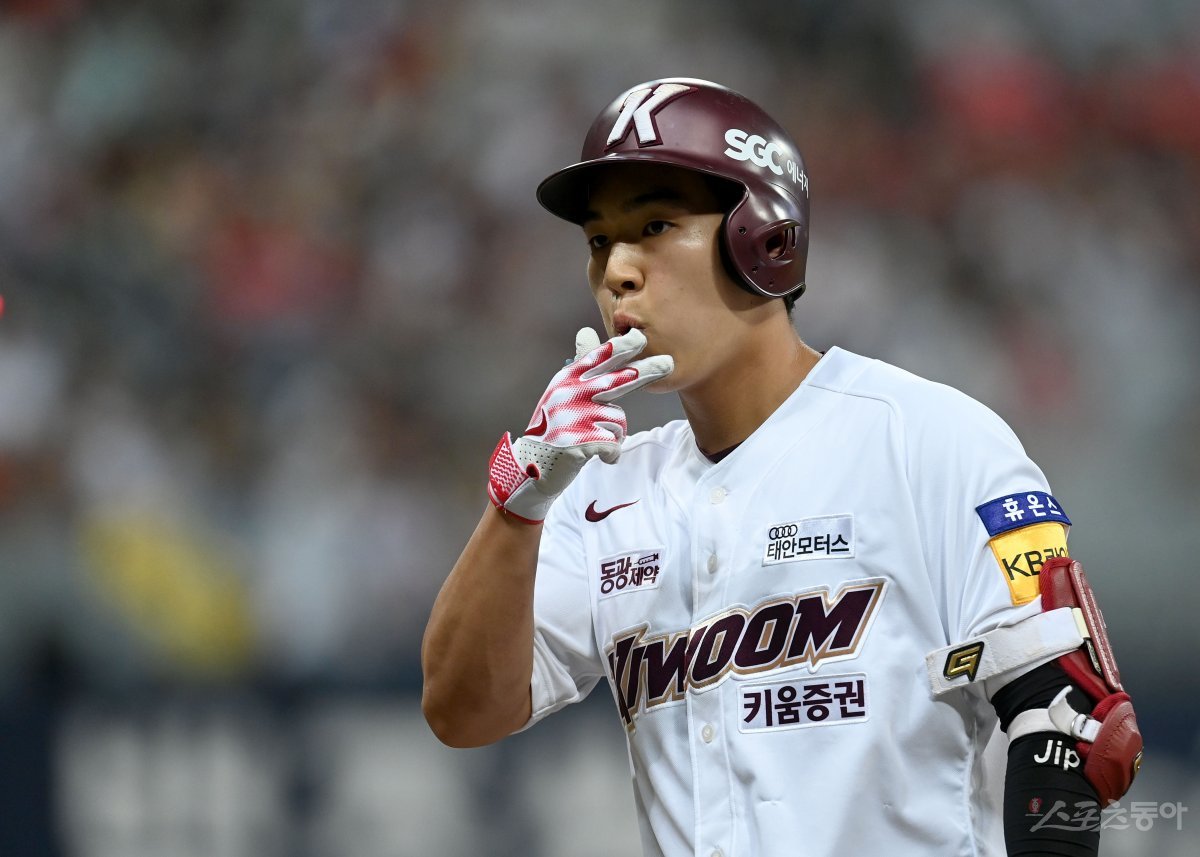 13일 서울 고척스카이돔에서 ‘2023 신한은행 SOL KBO리그’ KIA 타이거즈와 키움 히어로즈 경기가 열렸다. 4회말 2사 1루 키움 김휘집이 우전 안타를 치고 1루에서 기뻐하고 있다.
