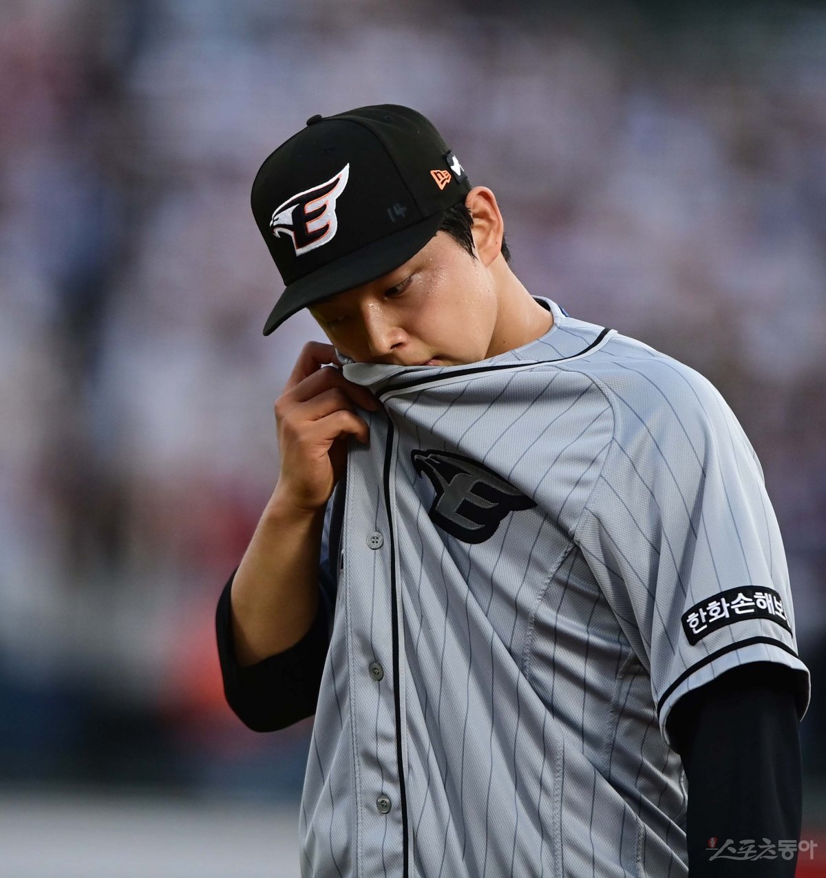 13일 부산 사직야구장에서 열린 ‘2023 신한은행 SOL KBO리그’ 롯데 자이언츠와 한화 이글스의 경기에서 2회말 2사 1루 롯데에 중전 안타를 허용한 한화 문동주가 아쉬워하고 있다.