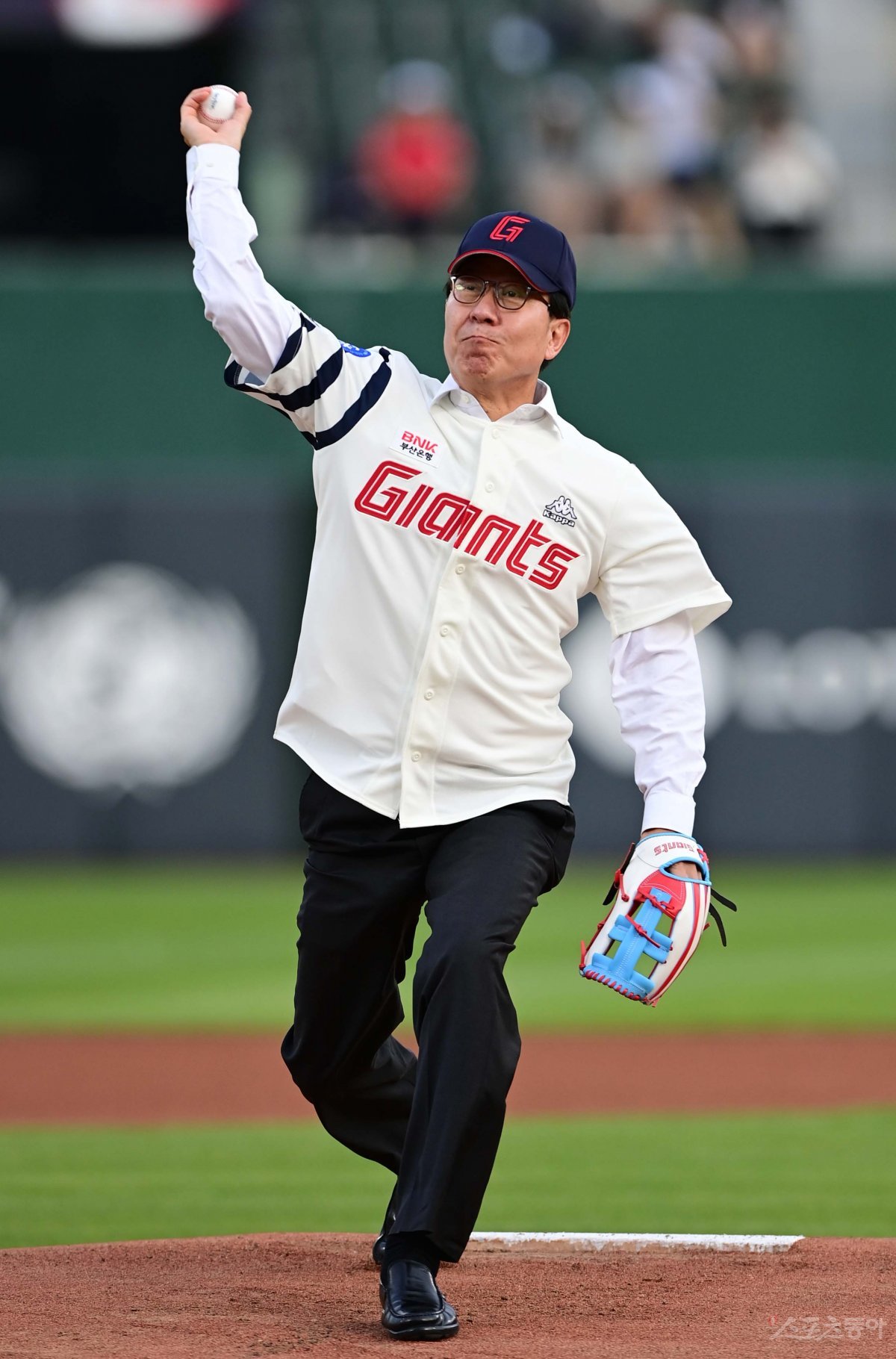 13일 부산 사직야구장에서 열린 ‘2023 신한은행 SOL KBO리그’ 롯데 자이언츠와 한화 이글스의 경기에 앞서 박형준 부산 시장이 2023 부산세계박람회 유치를 위한 시구를 하고 있다.