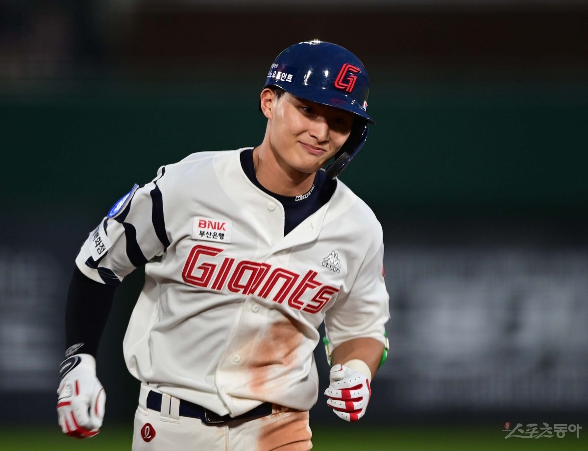 13일 부산 사직야구장에서 열린 ‘2023 신한은행 SOL KBO리그’ 롯데 자이언츠와 한화 이글스의 경기에서 3회말 1사 1, 2루 롯데 윤동희가 역전 좌월 3점홈런을 친 후 그라운드를 돌며 미소 짓고 있다.