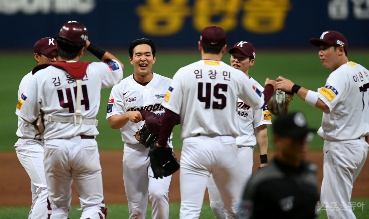 13일 서울 고척스카이돔에서 ‘2023 신한은행 SOL KBO리그’ KIA 타이거즈와 키움 히어로즈 경기가 열렸다. 1-0 승리를 거두며 3연승을 달린 키움 선수들이 하이파이브 하고 있다.