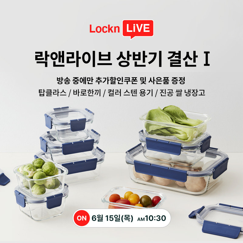 상반기 진행한 락앤라이브에서 소비자의 사랑을 받은 베스트 아이템을 뽑아 15, 27일 오전 10시30분에 소개한다. 15일에는 안심 내열유리 용기 ‘탑클라스’, 갓 지은 밥맛을 구현하는 ‘바로한끼’ 용기 시리즈, 주방을 화사하게 만드는 ‘컬러 스텐용기’, 진공·냉장 기능으로 쌀 보관 고민을 해결하는 ‘진공 쌀 냉장고’ 등을 만날 수 있다. 27일에는 인덕션 착붙냄비 슈트 IH, 와이드 계란말이팬, 음식물 쓰레기 냉장고 등을 소개한다.