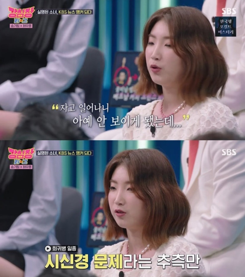 이날 ‘시각장애인 앵커’ 허우령 아나운서의 이야기는 모두에게 감동을 선사했다. 허우령은 14살, 어느 날 아침에 실명이 됐다면서 “짙은 안개가 낀 것처럼 흐릿하게 보였다. 엄마 아빠에게 눈이 안 보인다고 말했다. 부모님도 놀라셨고 엄청 울었다. 처음에는 당혹스러워서 이게 뭘까 싶었다”며 “시신경염이라고 하는데 지금도 원인은 모른다”고 말했다. 허우령의 고백에 강호동을 포함해 출연자들은 눈물을 보이기도 했다.