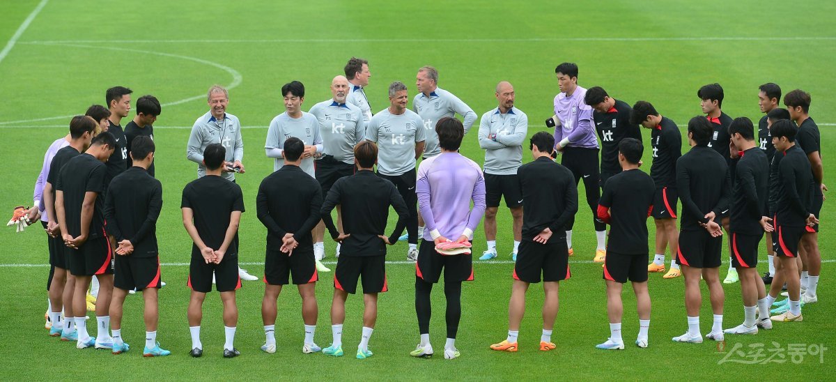 축구국가대표팀이 14일 부산 구덕운동장에서 페루, 엘살바도르와 친선경기에 앞서 소집 훈련을 진행했다. 한국 클린스만 감독과 선수들이 팀미팅을 하고 있다.