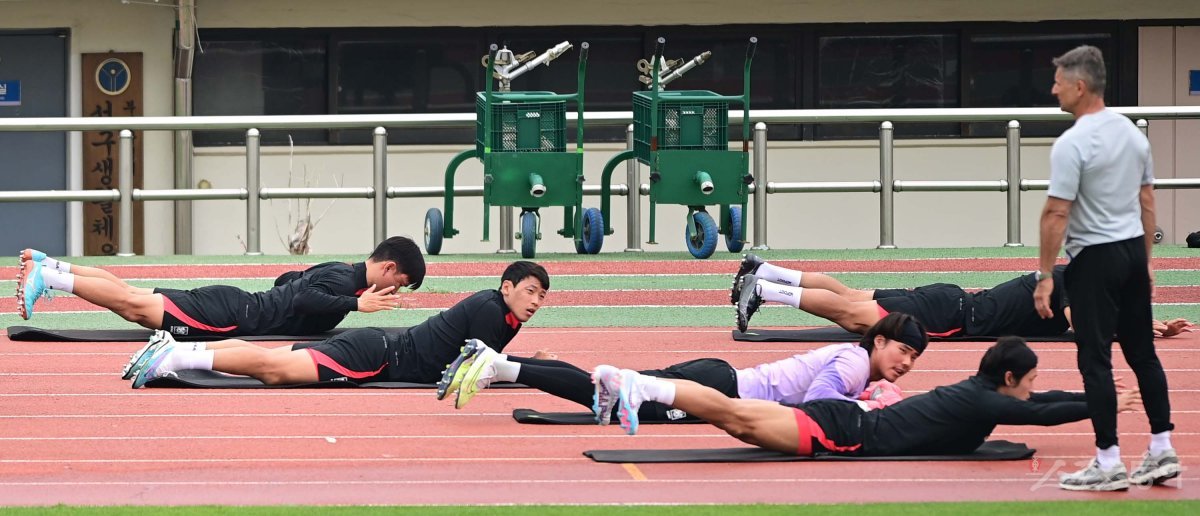 축구국가대표팀이 14일 부산 구덕운동장에서 페루, 엘살바도르와 친선경기에 앞서 소집 훈련을 진행했다. 한국 황희찬과 송범근이 스트레칭으로 몸을 풀고 있다.