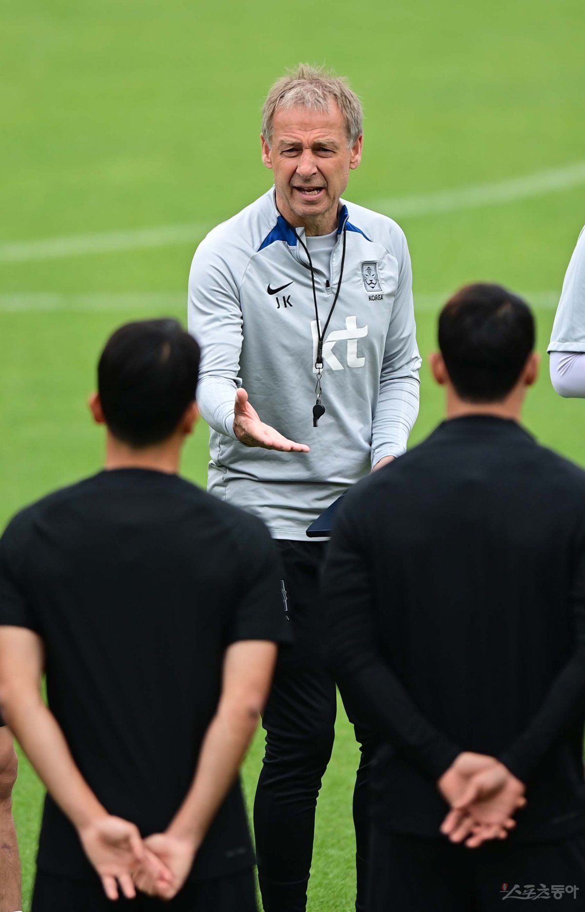 축구국가대표팀이 14일 부산 구덕운동장에서 페루, 엘살바도르와 친선경기에 앞서 소집 훈련을 진행했다. 한국 클린스만 감독이 선수들과 팀 미팅을 하고 있다.