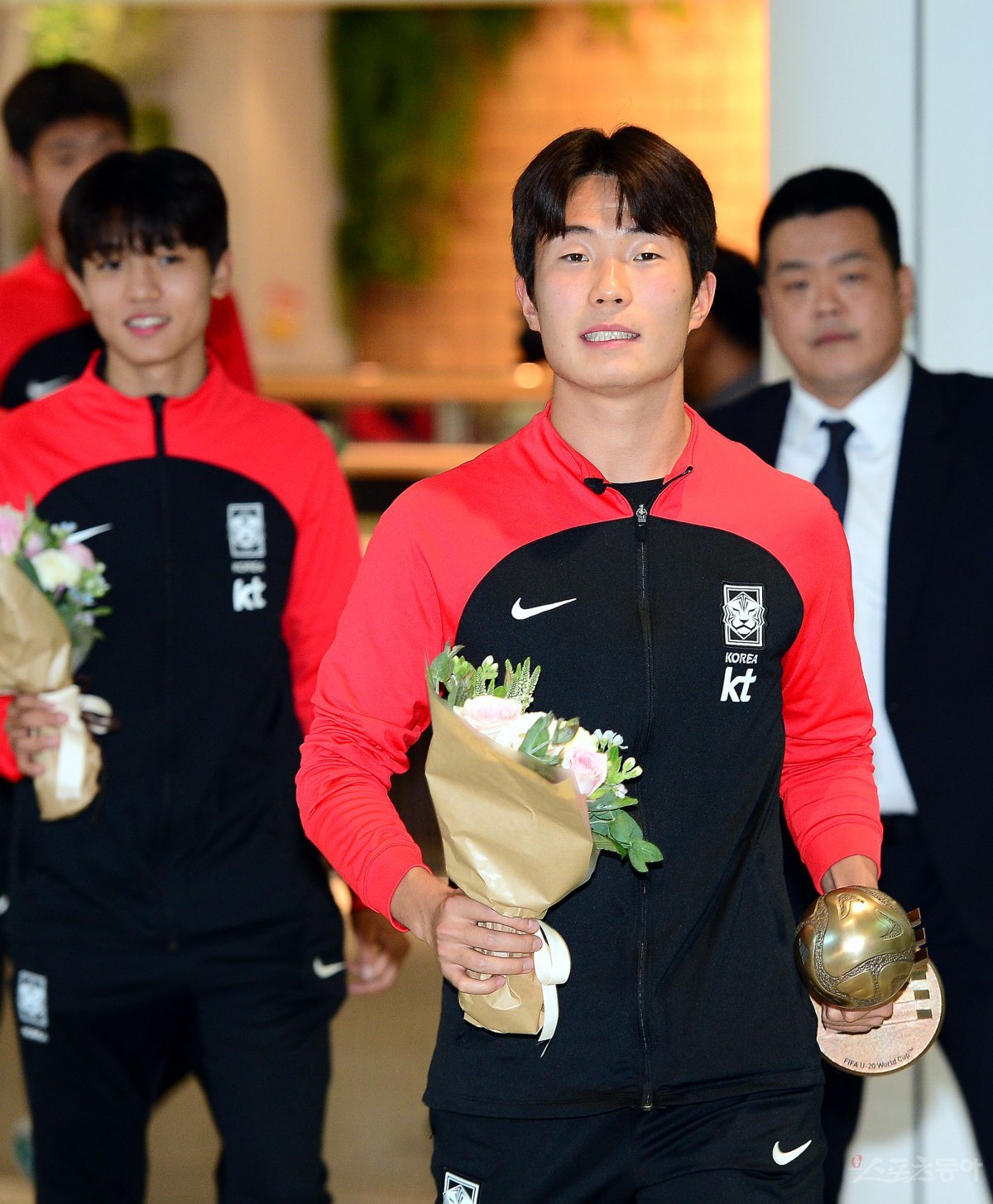 아르헨티나에서 열린 ‘2023 FIFA U-20 월드컵’에서 4강에 진출한 한국 U-20 축구국가대표팀이 14일 인천국제공항을 통해 귀국했다. 브론즈볼을 수상한 U-20 축구대표팀 이승원이 입국장을 나서고 있다.