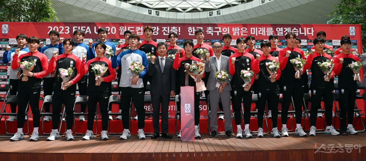 아르헨티나에서 열린 ‘2023 FIFA U-20 월드컵’에서 4강에 진출한 한국 U-20 축구국가대표팀이 14일 인천국제공항을 통해 귀국했다. 환영행사에 참석한 U-20 김은중 감독을 비롯한 선수, 코칭 스탭 및 대한축구협회 정몽규 회장이 기념촬영을 하고 있다.