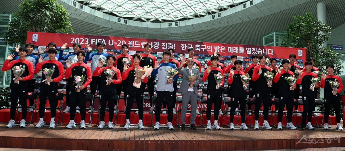 아르헨티나에서 열린 ‘2023 FIFA U-20 월드컵’에서 4강에 진출한 한국 U-20 축구국가대표팀이 14일 인천국제공항을 통해 귀국했다. 환영행사에 참석한 U-20 김은중 감독을 비롯한 선수, 코칭 스탭이 기념촬영을 하고 있다.