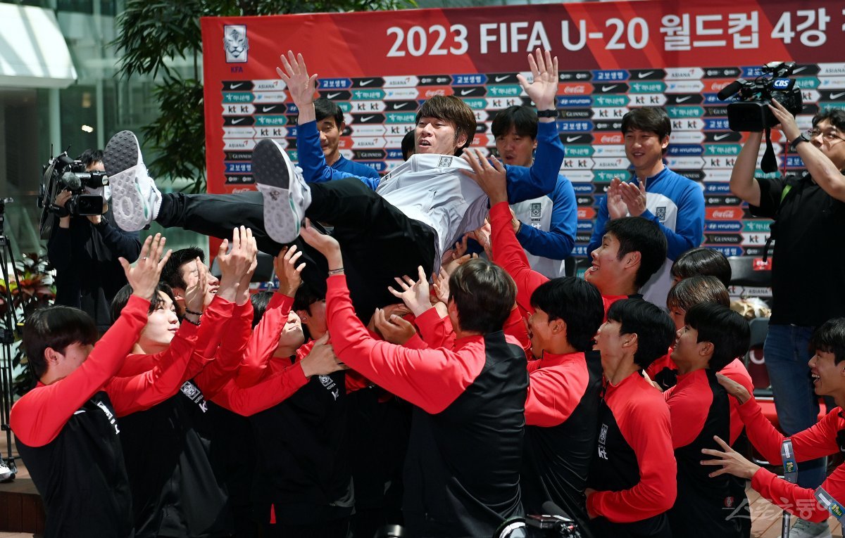 아르헨티나에서 열린 ‘2023 FIFA U-20 월드컵’에서 4강에 진출한 한국 U-20 축구국가대표팀이 14일 인천국제공항을 통해 귀국했다. 환영행사에 참석한 U-20 김은중 감독이 선수들로부터 헹가래 세례를 받고 있다.