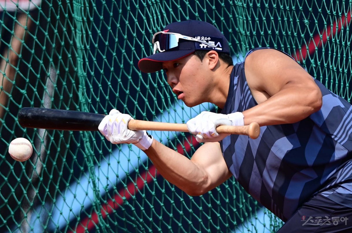 14일 부산 사직야구장에서 열린 ‘2023 신한은행 SOL KBO리그’ 롯데 자이언츠와 한화 이글스의 경기에 앞서 롯데 손성빈이 번트 연습을 하고 있다.