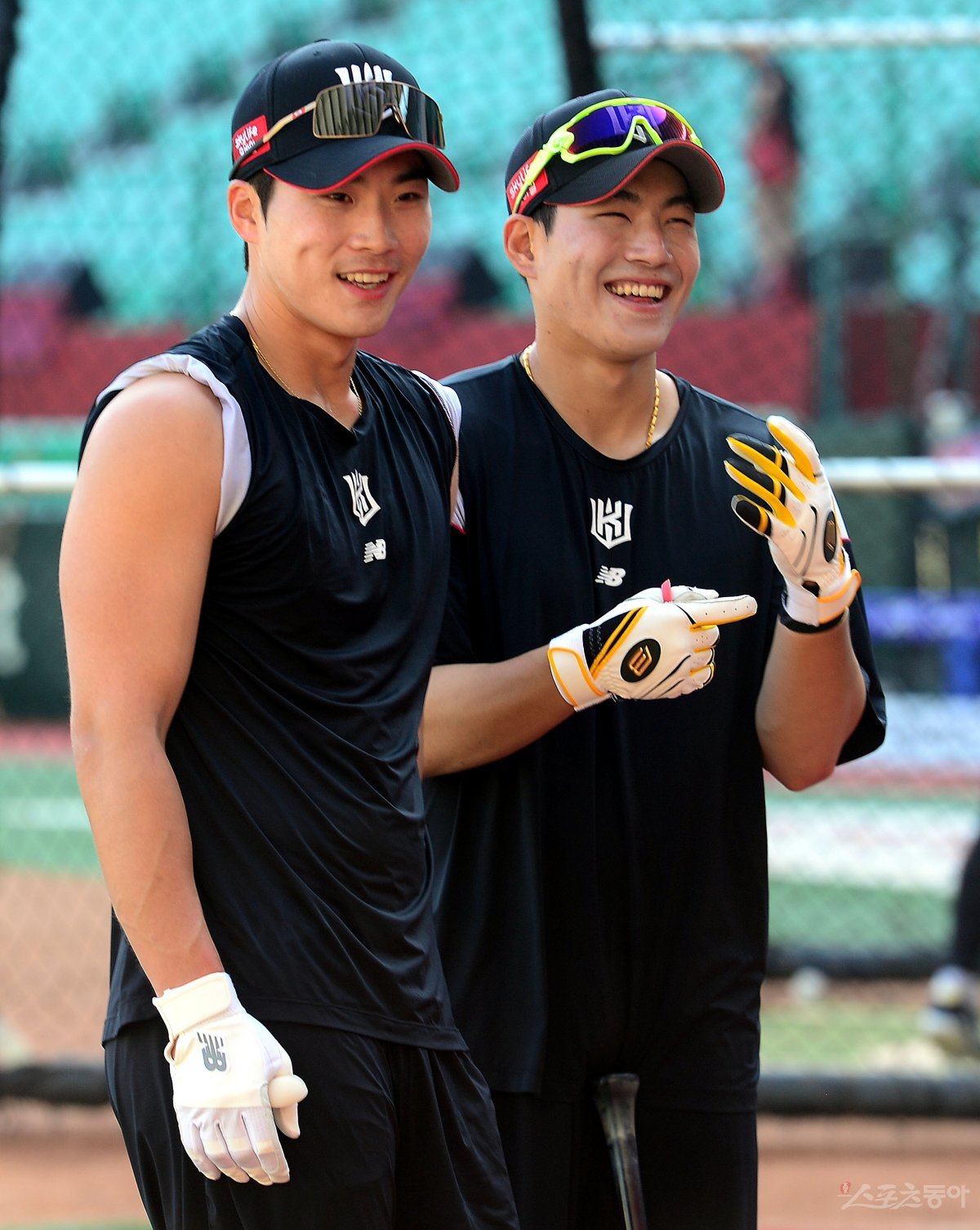 14일 인천 SSG 랜더스필드에서 ‘2023 신한은행 SOL KBO리그’ SSG 랜더스와 kt 위즈의 경기가 열린다. 경기에 앞서 kt 장준원과 강현우가 이야기를 나누고 있다.