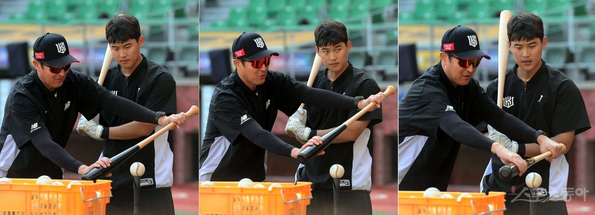 14일 인천 SSG 랜더스필드에서 ‘2023 신한은행 SOL KBO리그’ SSG 랜더스와 kt 위즈의 경기가 열린다. 경기에 앞서 kt 이숭용 코치가 배정대에게 타격을 지도하고 있다.
