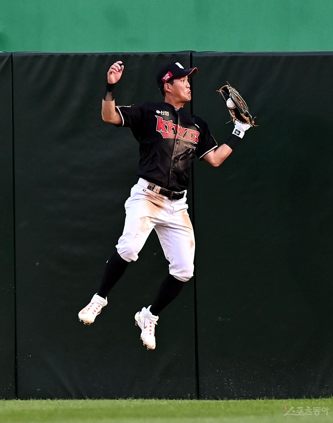 14일 인천 SSG 랜더스필드에서 ‘2023 신한은행 SOL KBO리그’ SSG 랜더스와 kt 위즈의 경기가 열렸다. 3회말 1사에서 kt 배정대가 펜스 앞에서 호수비를 펼치고 있다.