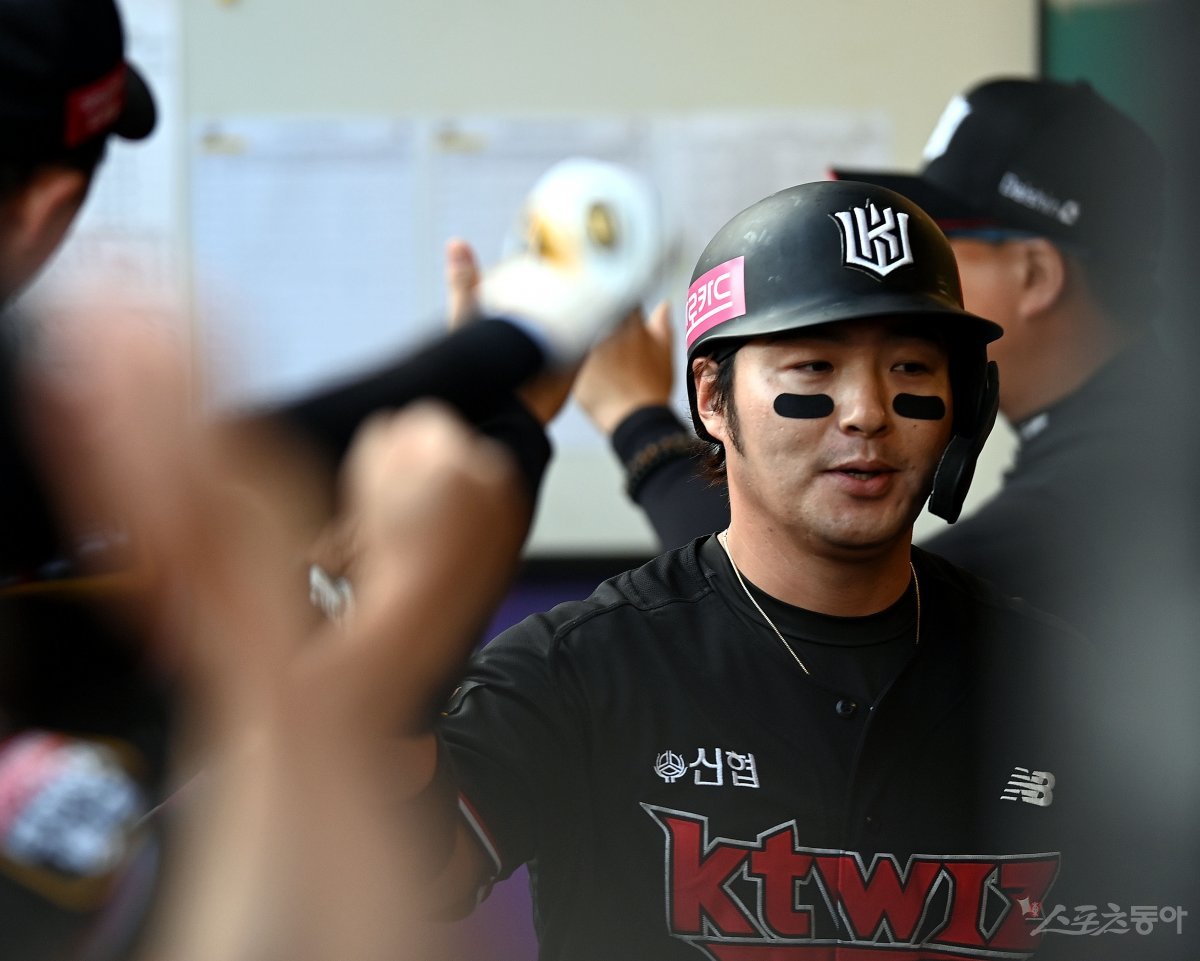 14일 인천 SSG 랜더스필드에서 ‘2023 신한은행 SOL KBO리그’ SSG 랜더스와 kt 위즈의 경기가 열렸다. 1회초 무사 만루에서 kt 박병호가 만루 홈런을 쏘아 올린 후 동료들의 환영을 받고 있다.