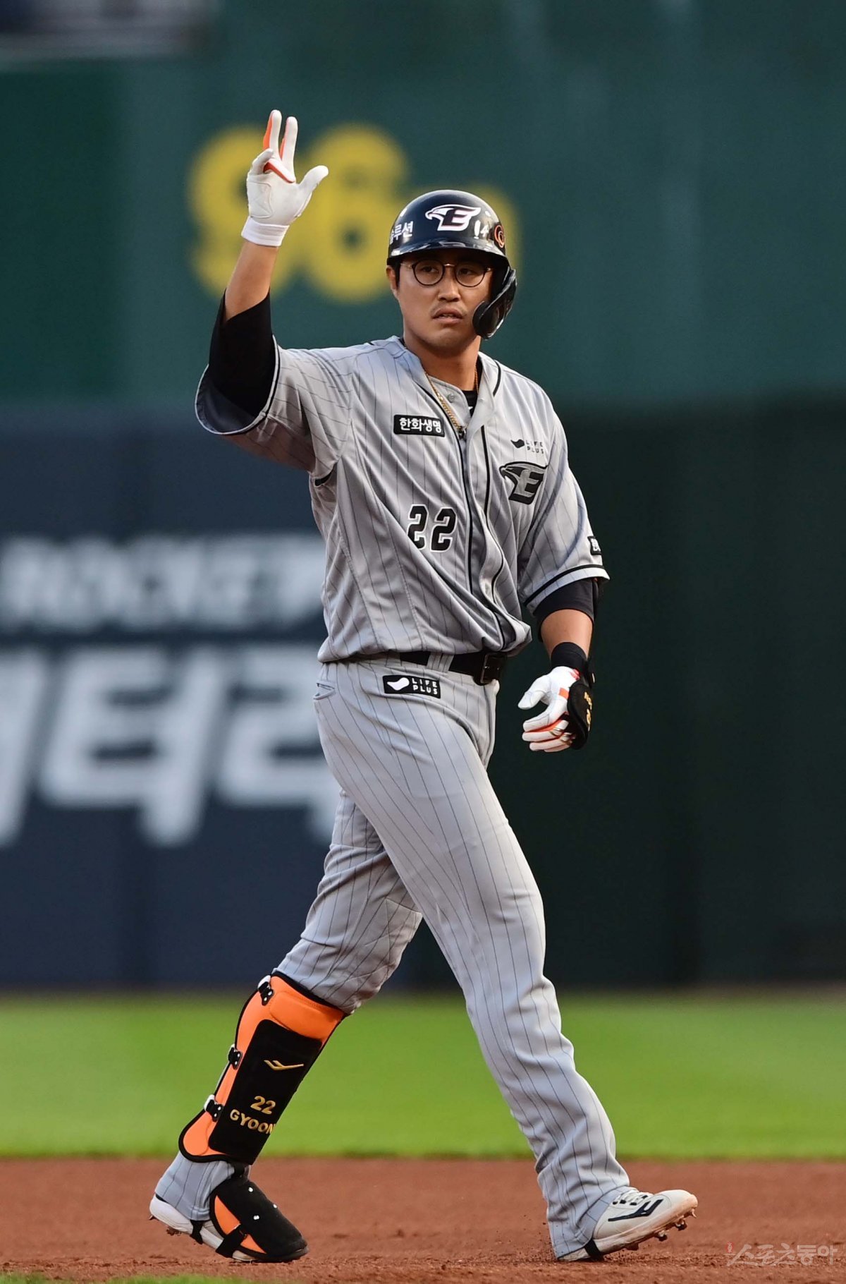 14일 부산 사직야구장에서 열린 ‘2023 신한은행 SOL KBO리그’ 롯데 자이언츠와 한화 이글스의 경기에서 1회초 1사 2, 3루 한화 채은성이 선제 2타점 좌전 적시타를 친 후 세리머니를 하고 있다.