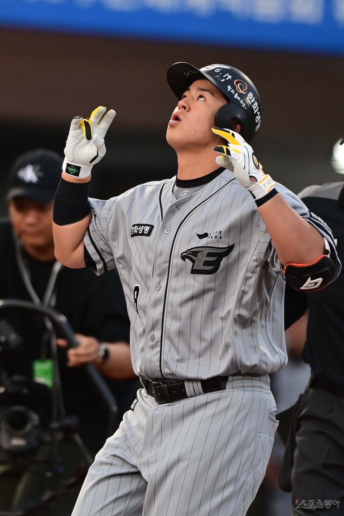 14일 부산 사직야구장에서 열린 ‘2023 신한은행 SOL KBO리그’ 롯데 자이언츠와 한화 이글스의 경기에서 2회초 1사 1루 한화 노시환이 좌월 2점 홈런을 친 후 세리머니를 하고 있다.