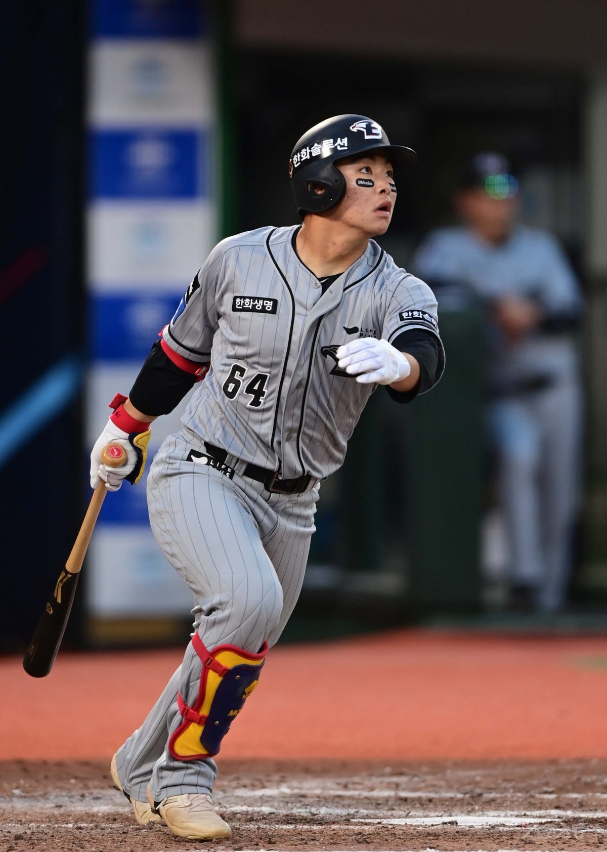 14일 부산 사직야구장에서 열린 ‘2023 신한은행 SOL KBO리그’ 롯데 자이언츠와 한화 이글스의 경기에서 3회초 1사 한화 문현빈이 우월 솔로 홈런으로 데뷔 첫 홈런을 기록하고 있다.