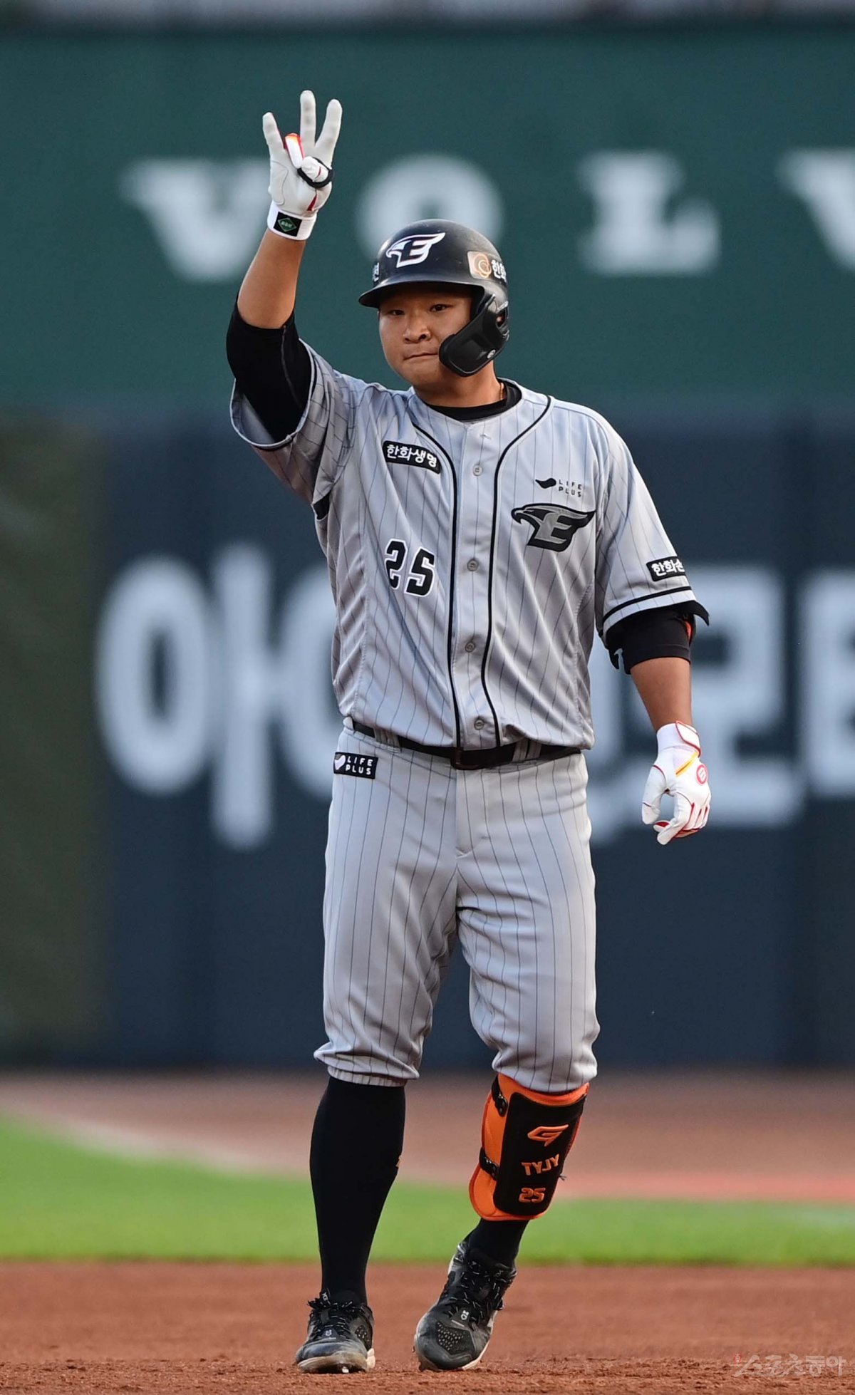 14일 부산 사직야구장에서 열린 ‘2023 신한은행 SOL KBO리그’ 롯데 자이언츠와 한화 이글스의 경기에서 1회초 1사 1, 3루 한화 김태연이 1타점 좌전 적시타를 친 후 세리머니를 하고 있다.