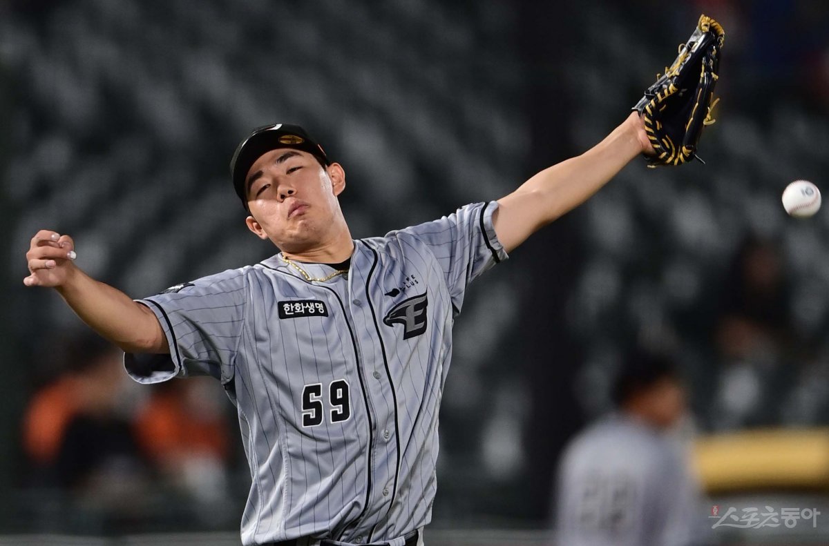 14일 부산 사직야구장에서 열린 ‘2023 신한은행 SOL KBO리그’ 롯데 자이언츠와 한화 이글스의 경기에서 5회말 한화 한승주가 마운드에 올라가며 심판에 던진 볼을 놓치고 있다.