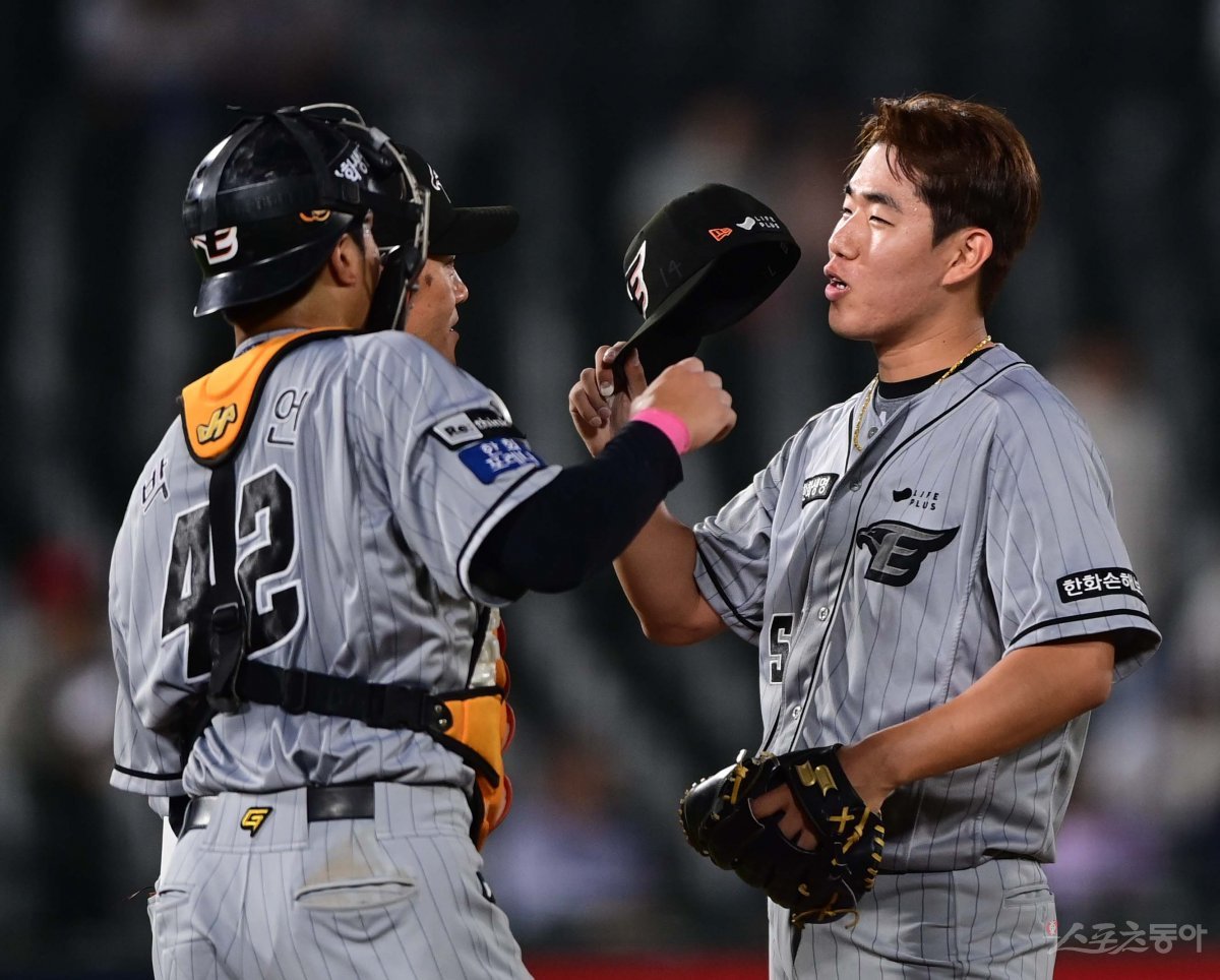 14일 부산 사직야구장에서 열린 ‘2023 신한은행 SOL KBO리그’ 롯데 자이언츠와 한화 이글스의 경기에서 5회말 1사 1루 상황에서 한화 한승주가 마운드를 내려가고 있다.