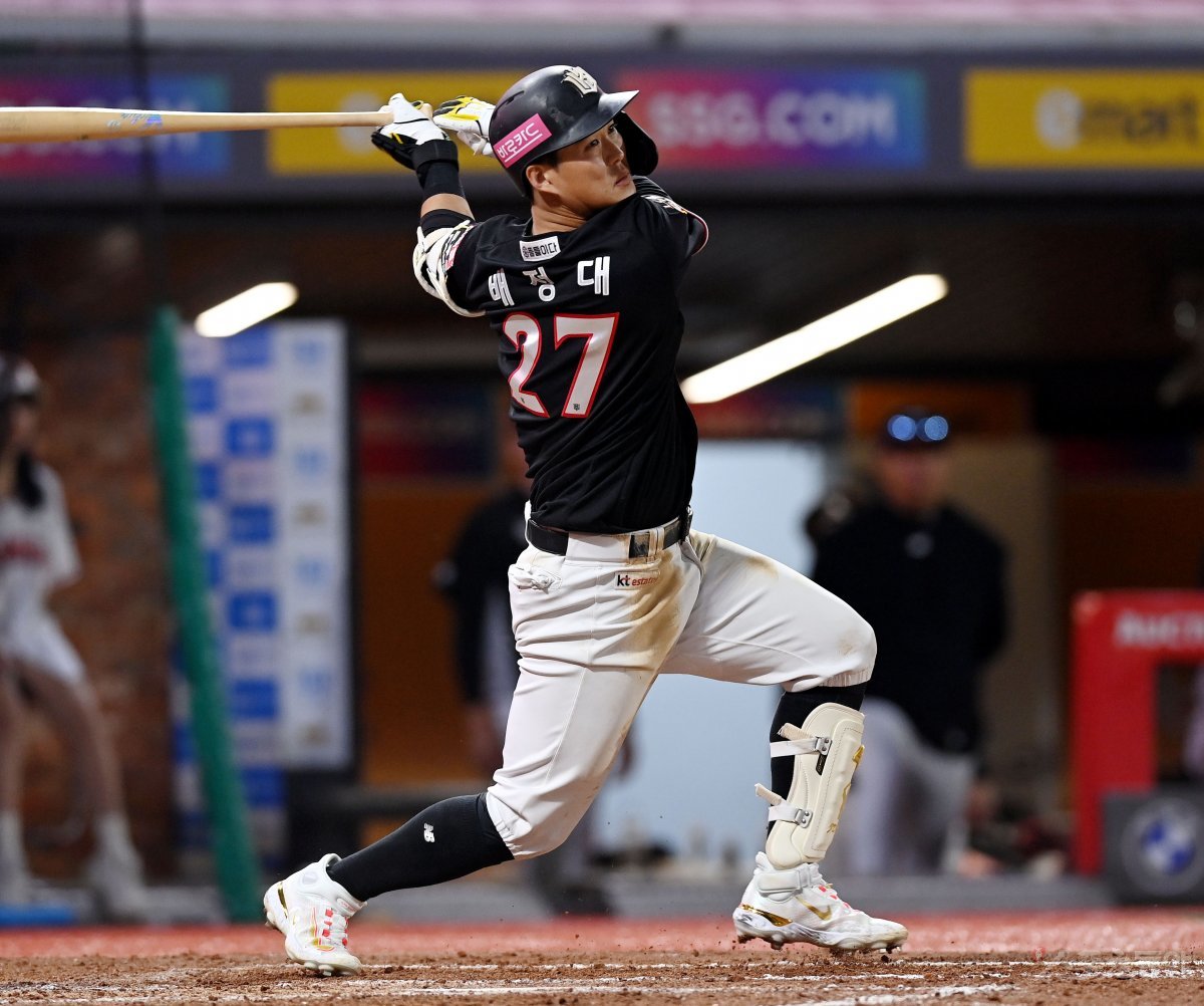 14일 인천 SSG 랜더스필드에서 ‘2023 신한은행 SOL KBO리그’ SSG 랜더스와 kt 위즈의 경기가 열렸다. 7회초 1사 1, 2루에서 kt 배정대가 1타점 적시타를 날리고 있다.
