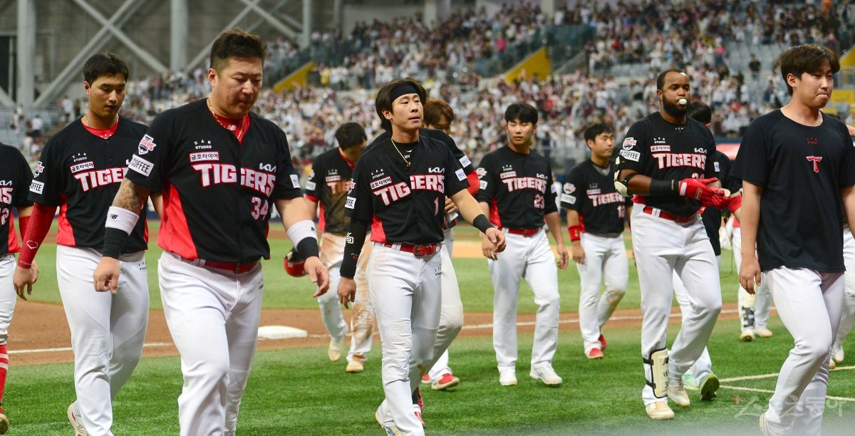 14일 서울 고척스카이돔에서 ‘2023 신한은행 SOL KBO리그’ KIA 타이거즈와 키움 히어로즈 경기가 열렸다. 1-2 역전패를 당한 KIA 선수들이 더그아웃으로 들어가고 있다.
