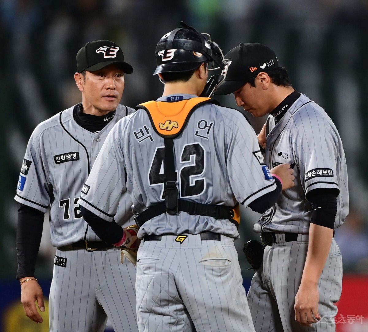 14일 부산 사직야구장에서 열린 ‘2023 신한은행 SOL KBO리그’ 롯데 자이언츠와 한화 이글스의 경기에서 6회말 2사 2루 상황에서 한화 송윤준이 마운드를 내려가고 있다.