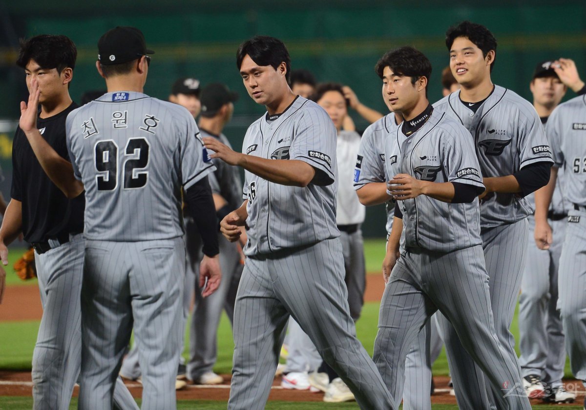14일 부산 사직야구장에서 열린 ‘2023 신한은행 SOL KBO리그’ 롯데 자이언츠와 한화 이글스의 경기에서 8-4로 승리한 한화 선수들이 감독과 기쁨을 나누고 있다.