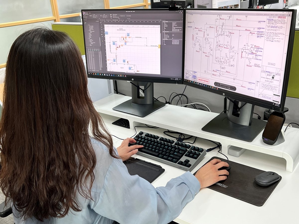 현대엔지니어링 직원이 ‘공정 배관 계장도(P&ID) 자동 인식 시스템’을 이용한 설계도면 인식 테스트를 진행하고 있다. 사진제공|현대엔지니어링