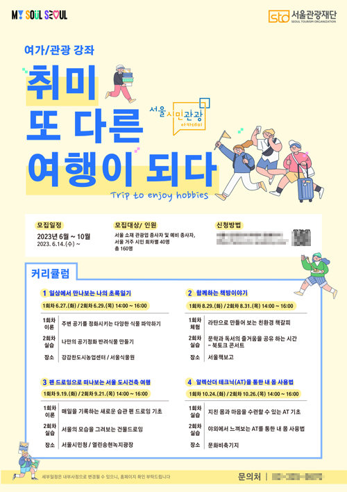 여가 및 관광 강좌 ‘취미 또 다른 여행이 되다’는 27일부터 11월까지 식물 여가, 도시건축 등 다양한 분야의 주제를 다룰 예정이다. 27일부터 ‘일상에서 만나보는 나의 초록일기’라는 주제의 식물 여가 강좌를 시작으로 7월 ‘함께하는 책방이야기’, 9월 ‘펜 드로잉으로 떠나보는 서울 도시건축 여행’, 10월 ‘알렉산더 테크닉을 통한 내 몸 사용법’ 등을 진행한다.