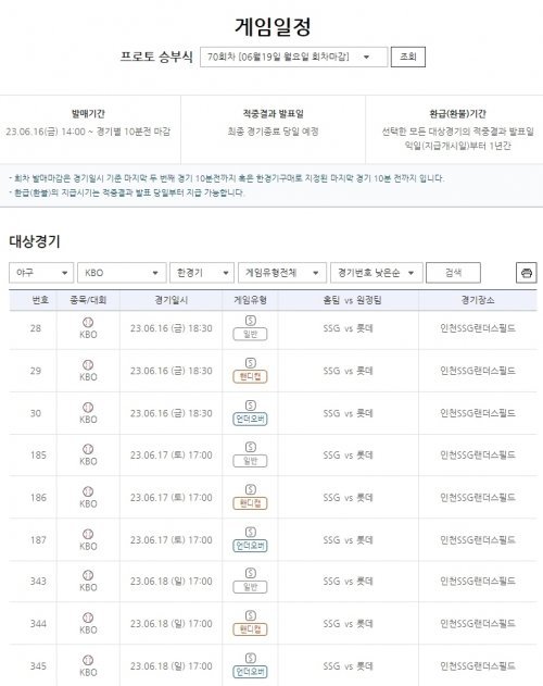 프로토 승부식 70회차 중 SSG(홈)-롯데(원정)전을 대상으로 하는 ‘한경기구매’ 게임은 16일 오후 2시부터 참여가 가능하다. 먼저 16일 오후 6시30분 열리는 경기를 대상으로 하는 게임은 ▲28번(일반) ▲29번(핸디캡) ▲30번(언더오버)으로 참여가 가능하다.