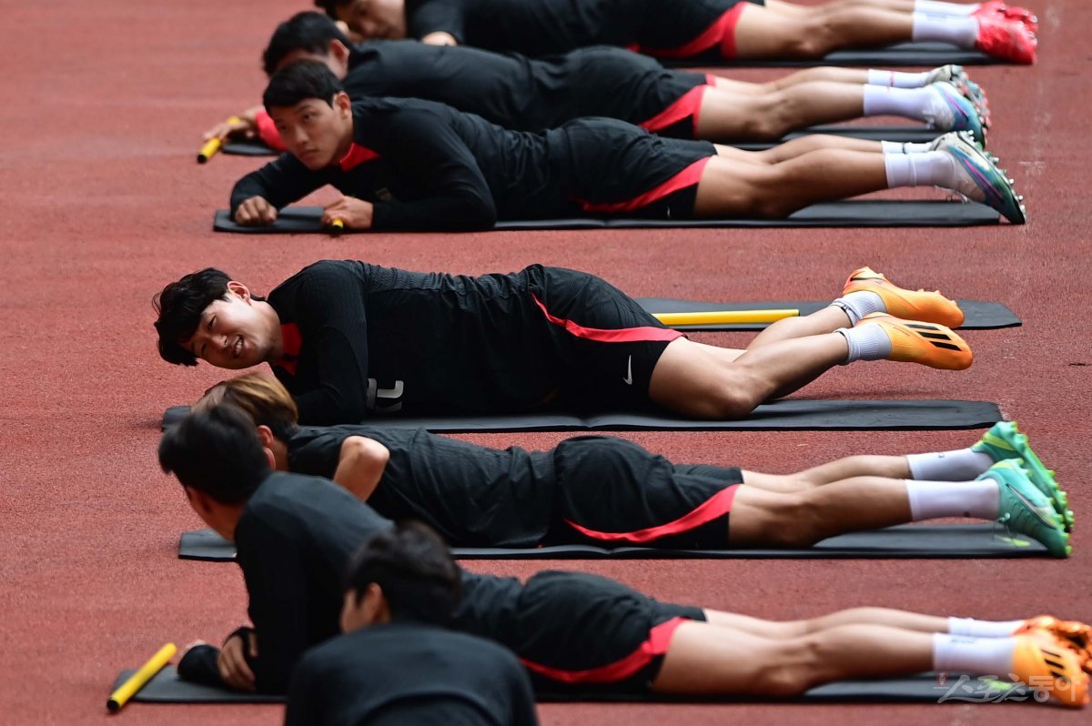 축구국가대표팀이 15일 부산아시아드 주경기장에서 페루, 엘살바도르와 친선경기에 앞서 소집 훈련을 진행했다. 한국 손흥민이 스트레칭으로 몸을 풀고 있다.