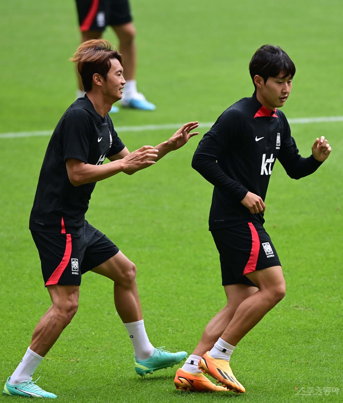 축구국가대표팀이 15일 부산아시아드 주경기장에서 페루, 엘살바도르와 친선경기에 앞서 소집 훈련을 진행했다. 한국 김진수가 이강인에게 장난을 치고 있다.