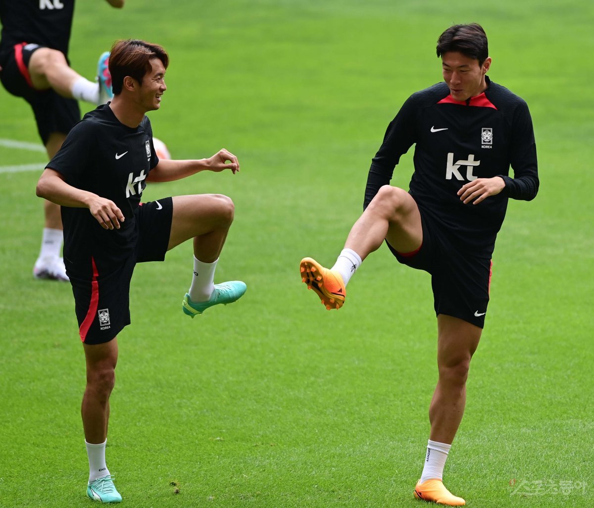 축구국가대표팀이 15일 부산아시아드 주경기장에서 페루, 엘살바도르와 친선경기에 앞서 소집 훈련을 진행했다. 한국 김진수와 황의조가 이야기를 하고 있다.
