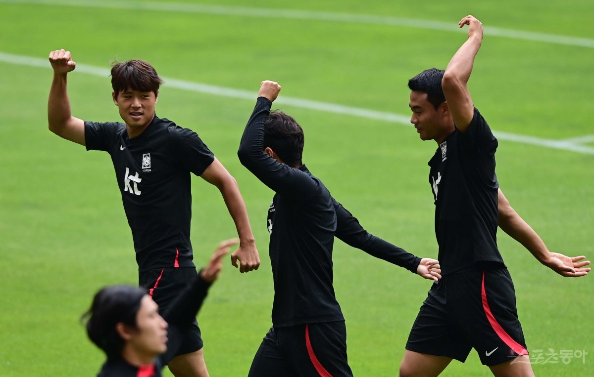 축구국가대표팀이 15일 부산아시아드 주경기장에서 페루, 엘살바도르와 친선경기에 앞서 소집 훈련을 진행했다. 한국 김주성과 박지수가 훈련을 하고 있다.