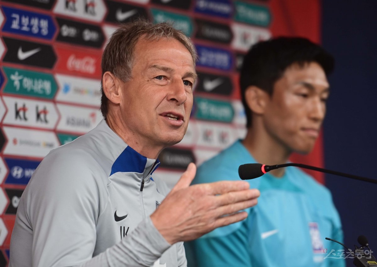 축구국가대표팀이 15일 부산아시아드 주경기장에서 페루, 엘살바도르와 친선경기에 앞서 소집 훈련을 진행했다. 한국 클린스만 감독이 훈련 전 공식회견에서 취재진의 질문에 답하고 있다.