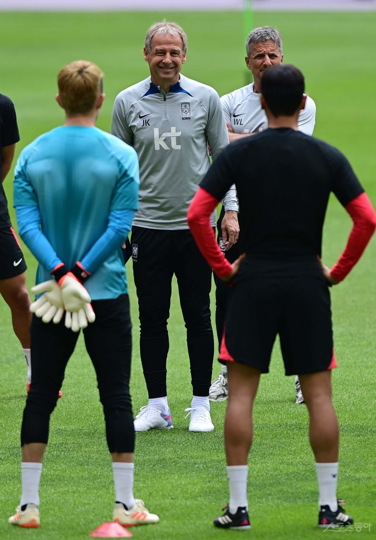 축구국가대표팀이 15일 부산아시아드 주경기장에서 페루, 엘살바도르와 친선경기에 앞서 소집 훈련을 진행했다. 한국 클린스만 감독이 선수들과 팀 미팅을 하고 있다.