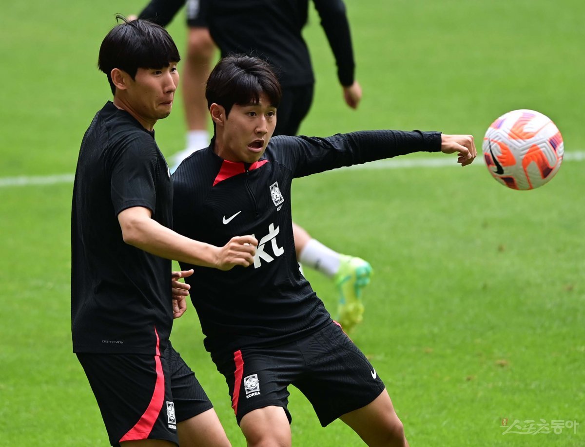 축구국가대표팀이 15일 부산아시아드 주경기장에서 페루, 엘살바도르와 친선경기에 앞서 소집 훈련을 진행했다. 한국 홍현석과 이강인이 몸싸움을 하고 있다.