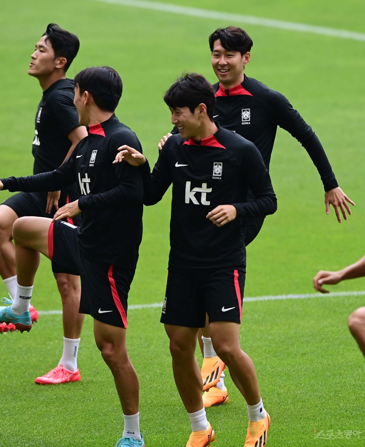 축구국가대표팀이 15일 부산아시아드 주경기장에서 페루, 엘살바도르와 친선경기에 앞서 소집 훈련을 진행했다. 한국 이강인의 장난에 손흥민이 웃고 있다.