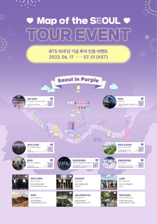 서울관광재단(대표이사 길기연)은 방탄소년단 데뷔 10주년을 기념해 17일부터 ‘BTS 10주년 기념 투어’ 이벤트를 진행한다.인스타그램 계정을 보유하고 있다면 누구나 참여할 수 있다. 서울 시내 방탄소년단 관련 13개 명소 중 한 곳 이상을 방문하고 인증사진을 업로드하면 된다. 13개의 BTS 서울 명소는 서울 숭례문, 하이브 용산 사옥, 경복궁 근정전, 여의도 한강공원, 을지로, 국립중앙박물관, 서울종합운동장 등 멤버들이 자주 찾던 장소와 자체 콘텐츠 프로그램 ‘달려라 방탄’ 촬영지 등이 포함된다.