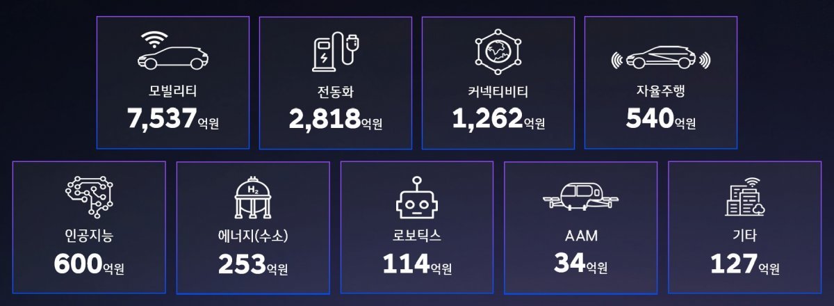 현대차·기아가 투자한 스타트업들의 사업 분야를 살펴보면 모빌리티 분야가 7537억 원으로 가장 많고, 전동화 2818억 원, 커넥티비티 1262억 원, 인공지능 600억 원, 자율주행 540억 원, 에너지(수소 포함) 253억 원 등이다.
