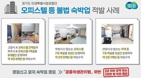 주요 위반 사례를 보면 숙박 예약사이트에서 1명의 영업주가 2개의 호스트 계정으로 고양시 ‘A’ 업소 오피스텔 3객실, 파주시 ‘B’ 업소 오피스텔 1객실을 빌려 불법으로 숙박업을 운영하며 9개월간 3600만 원의 불법 매출을 올리다가 적발됐다.