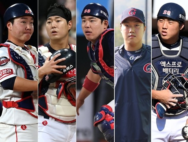 롯데 정보근·강태율·지시완·서동욱·손성빈(왼쪽부터). 사진 | 스포츠동아DB, 롯데 자이언츠