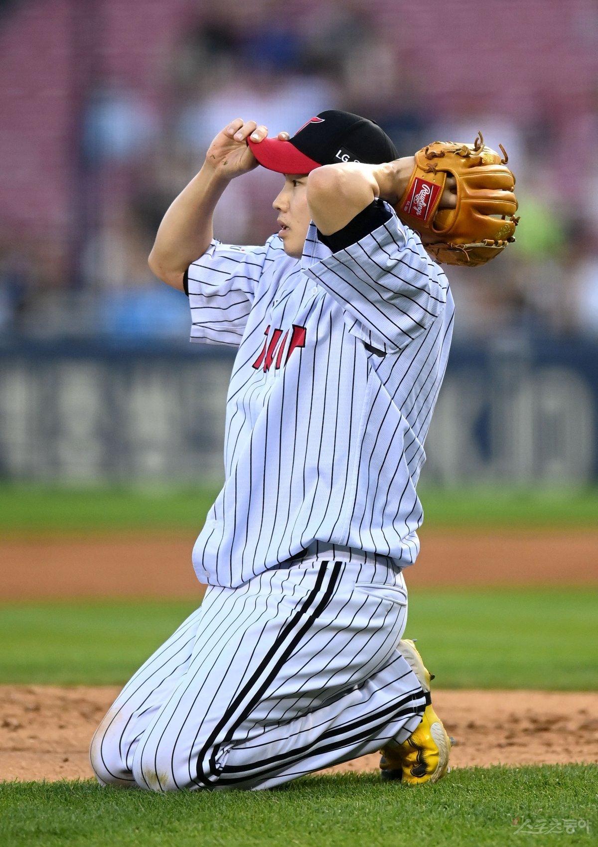 15일 서울 잠실야구장에서 ‘2023 신한은행 SOL KBO리그’ 삼성 라이온즈와 LG 트윈스 경기가 열렸다. 선발 투수로 등판한 LG 임찬규가 4회초 2사 1루 상황에서 내얀 안타를 허용한 후 타구를 바라보고 있다.