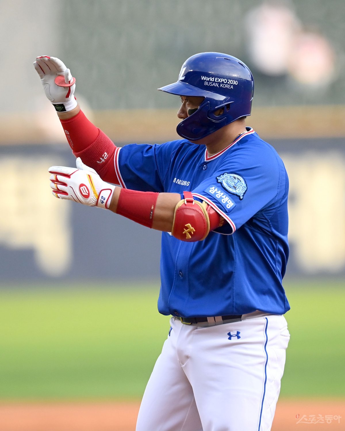 15일 서울 잠실야구장에서 ‘2023 신한은행 SOL KBO리그’ 삼성 라이온즈와 LG 트윈스 경기가 열렸다. 1회초 2사 1,2루 삼성 김태군이 선제 1타점 적시타를 치고 1루에서 기뻐하고 있다.