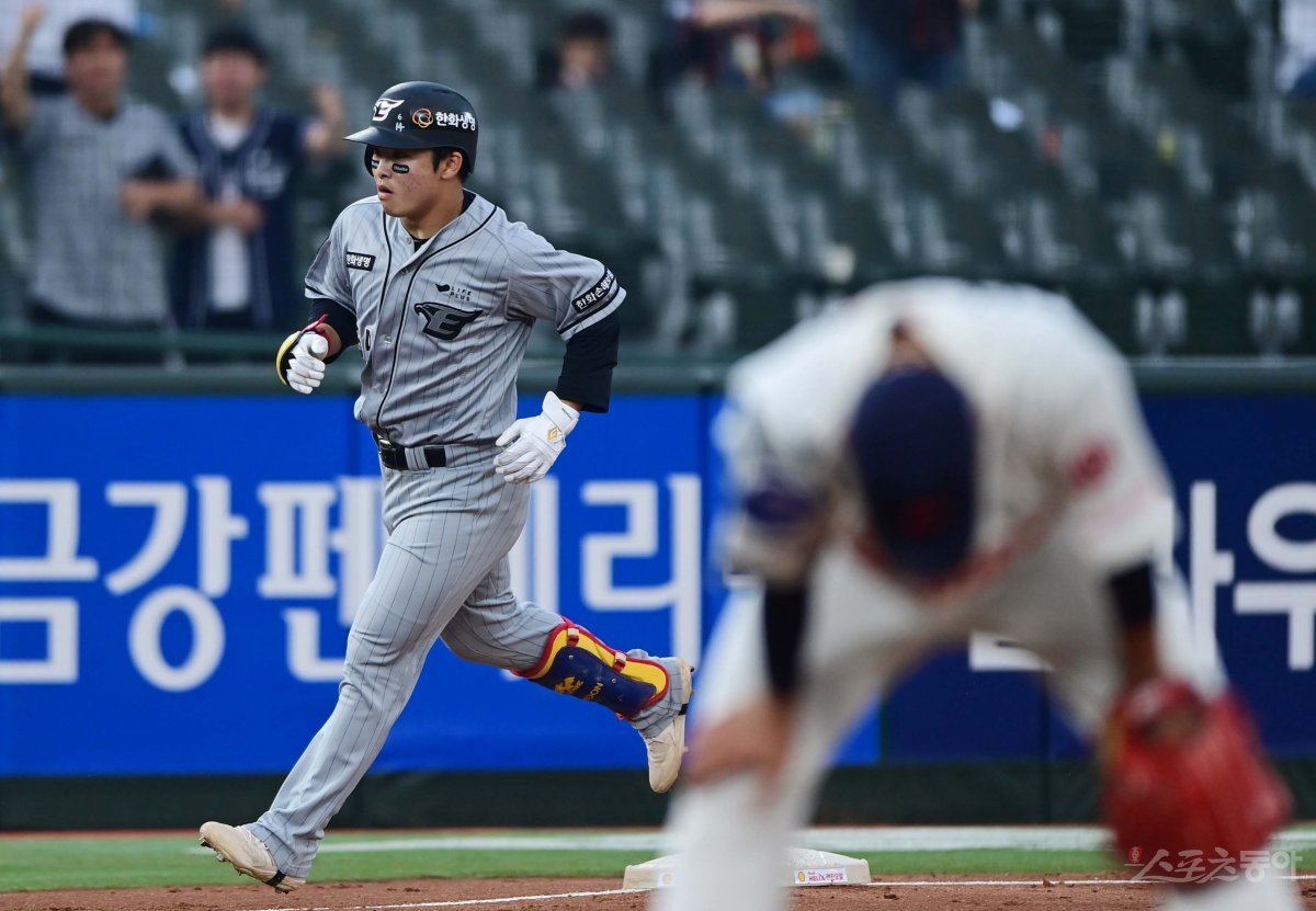 15일 부산 사직야구장에서 열린 ‘2023 신한은행 SOL KBO리그’ 롯데 자이언츠와 한화 이글스의 경기에서 3회초 2사 1루 한화 문현빈이 우월 2점 홈런을 친 후 그라운드를 돌고 있다.