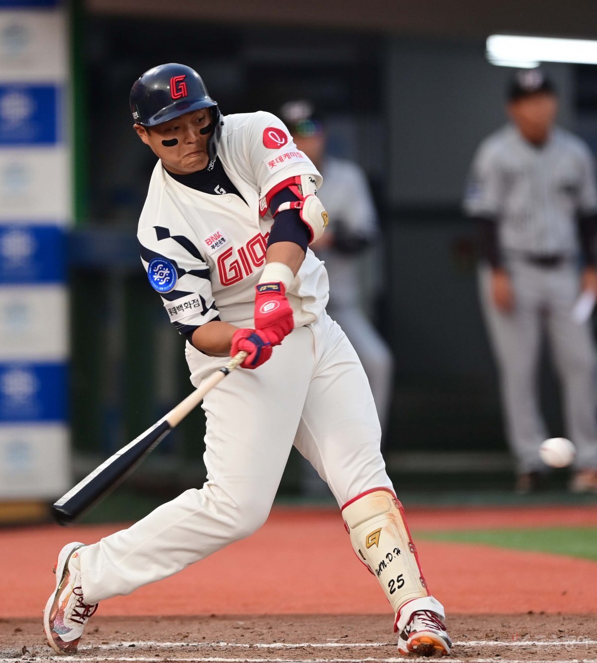 15일 부산 사직야구장에서 열린 ‘2023 신한은행 SOL KBO리그’ 롯데 자이언츠와 한화 이글스의 경기에서 2회말 2사 롯데 한동희가 타격을 하고 있다.