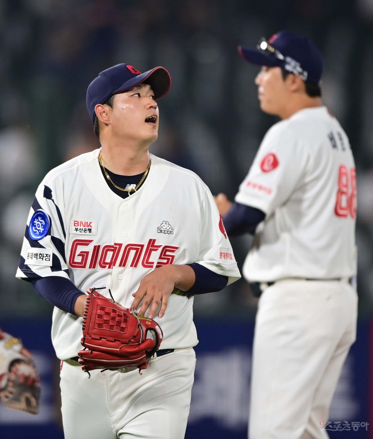 15일 부산 사직야구장에서 열린 ‘2023 신한은행 SOL KBO리그’ 롯데 자이언츠와 한화 이글스의 경기에서 5회초 무사 한화에 볼넷을 허용한 롯데 나균안이 마운드를 내려오고 있다.