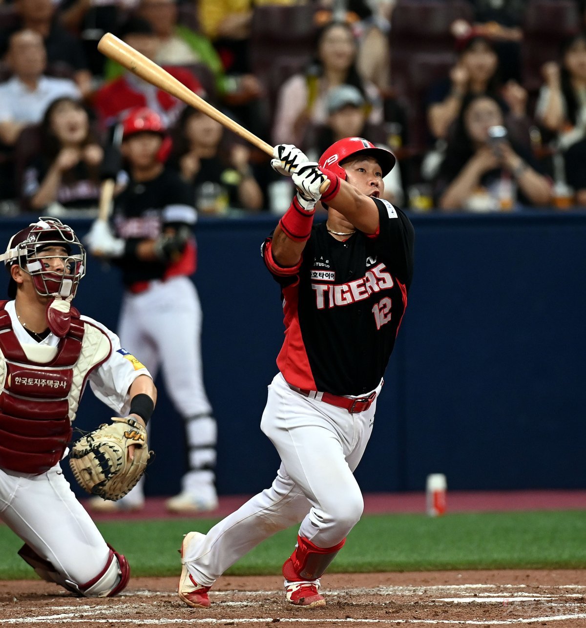 15일 서울 고척스카이돔에서 ‘2023 신한은행 SOL KBO리그’ 키움 히어로즈와 KIA 타이거즈의 경기가 열렸다. 4회초 2사 2루에서 KIA 신범수가 투런 홈런을 쏘아 올리고 있다.